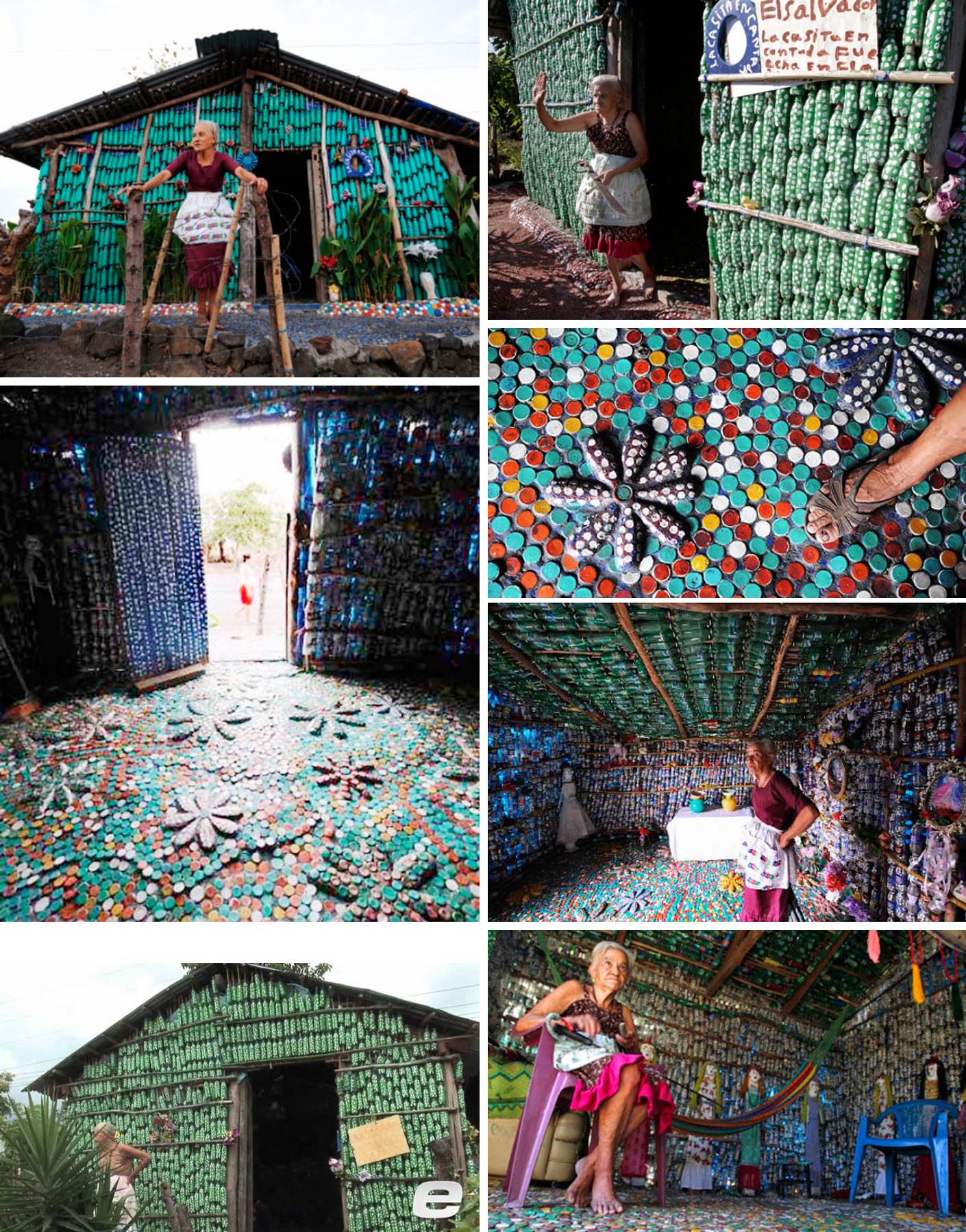 A necessidade é um motor potente que nos dá força, coragem e criatividade para seguirmos adiante, sempre! Esta senhora de 78 anos perdeu sua casa durante um terremoto no El Salvador, em 2001, e resolveu construir uma nova moradia utilizando garrafas PET. Fez tudo sozinha, desde a coleta do material até a colocação da última peça, levando aproximadamente 3 meses para concluir a obra e declara ter muito orgulho do seu trabalho, que acabou virando um ponto turístico muito apreciado. 😉