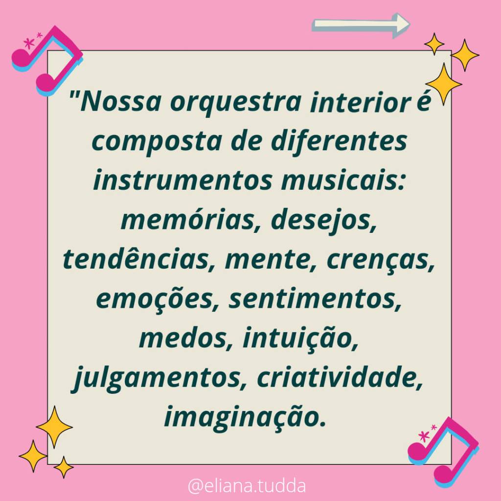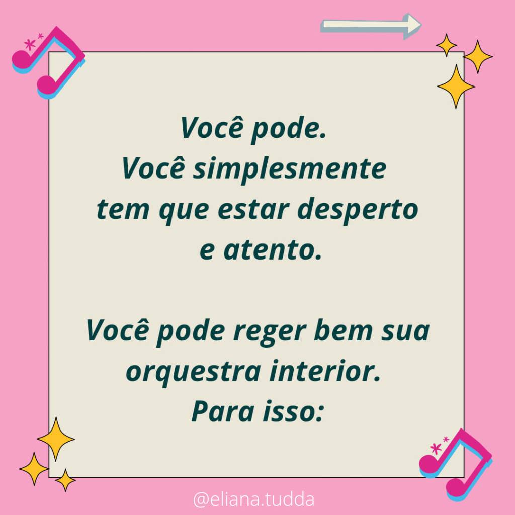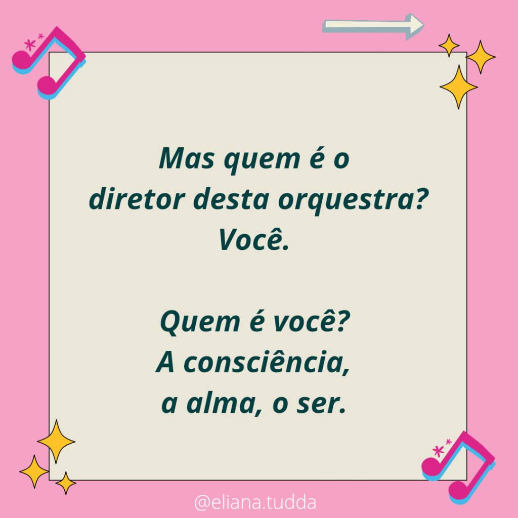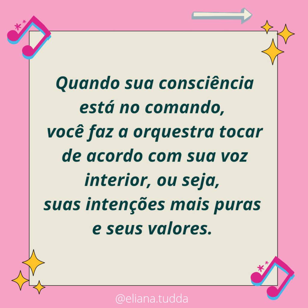 “Seja a maestrina da sua própria vida! Autoconsciência, autorresponsabilidade, clareza de objetivos, comprometimento, presença e fé são instrumentos essenciais da nossa orquestra interior.”