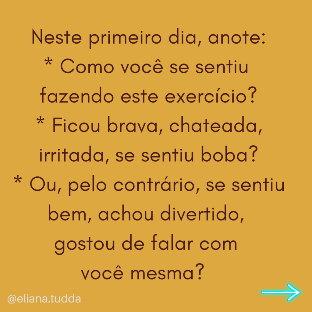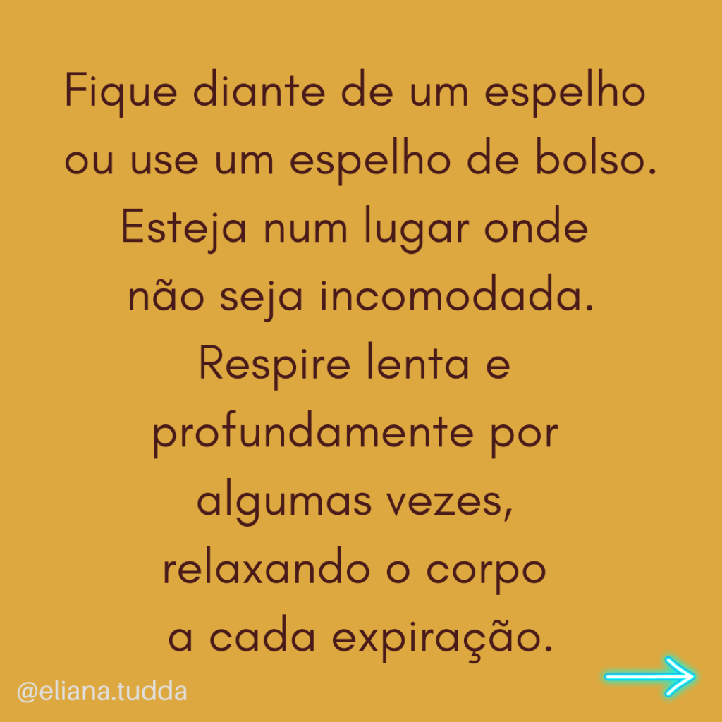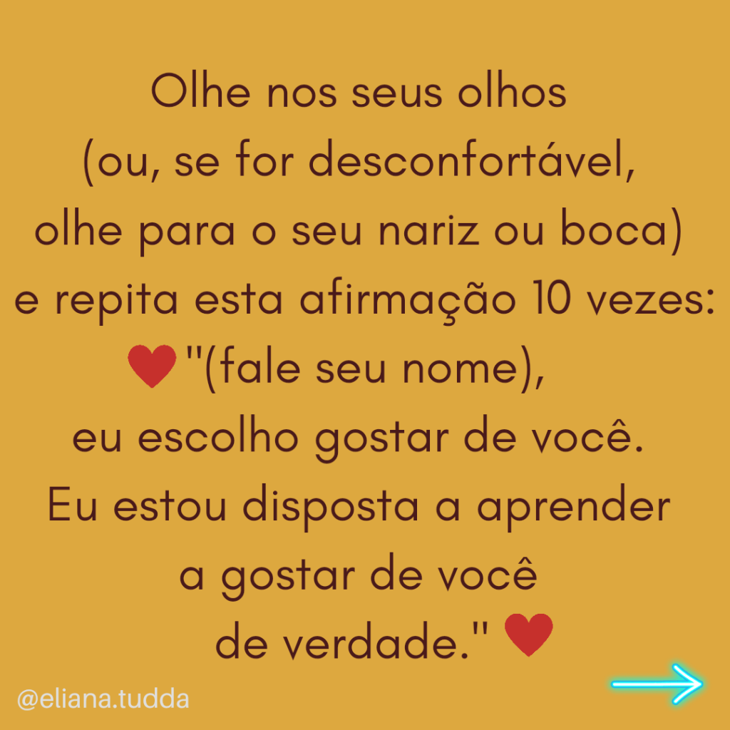 Se for a primeira vez que você conversa com você mesma diante de um espelho, pode ser um pouco desafiador mas insista em fazer isto. Vá adquirindo o hábito, praticando diariamente e com frequência, porque assim vai ficando mais fácil, mais leve. 🤗